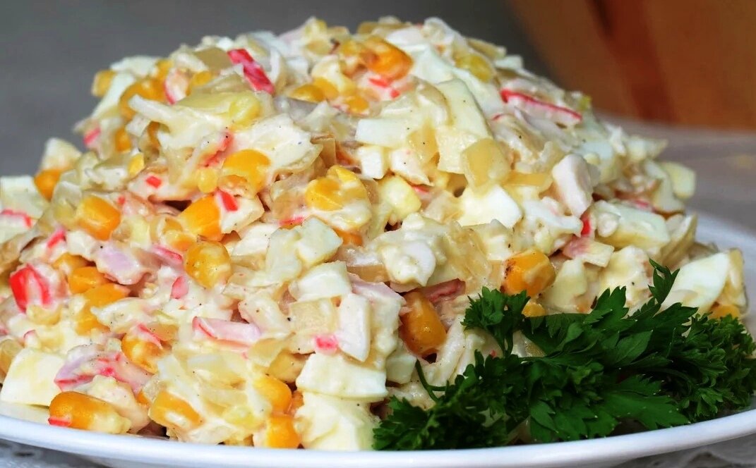 Вот простой и вкусный рецепт крабового салата с кукурузой: